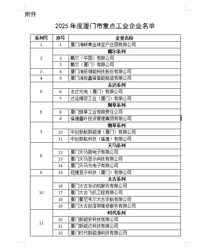 经第11次局党组会研究通过,现将2025年度厦门市重点工业企业名单印发给你们,请进一步强化工业经济运行监测工作,提高服务企业工作水平,推动工业经济高质量发展。